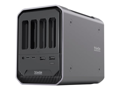 Effektivisera ditt arbetsflöde med PRO-DOCK 4-dockningsstationen. Med kompatibla SanDisk Professional PRO-READER-enheter installerade kan du samtidigt ladda flera minneskort i de fyra dedikerade läsarfacken och ansluta datorn till dina skärmar, enheter och A/V-enheter via en huvuddocka, allt medan den inbyggda 260 W strömförsörjningen hjälper till att ladda dina kompatibla enheter och tillbehör med 87 W strömleverans. Och du kan optimera ditt arbetsflöde med Thunderbolt-anslutning för blixtsnabba dataöverföringar och kedjekoppling.