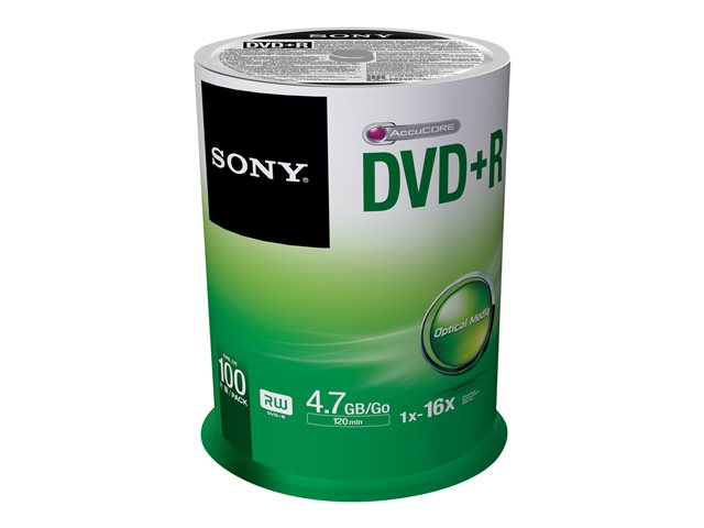 Förpackning med DVD+R med 16x-hastighet, levereras i 100-spindlig låda. Sony 100DPR47SP är idealisk för snabb datainspelning och praktisk masslagring.