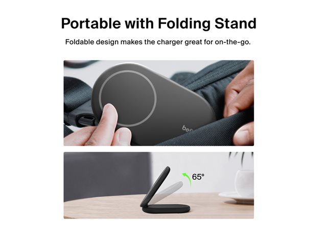 The Belkin BoostCharge wireless charging stand features a sleek design with a foldable structure, making it convenient for both travel and home use. It is equipped with magnetic alignment and is compatible with MagSafe, allowing for a secure and efficient charging experience for cellular phones. The charging stand provides up to 15 W of power and supports fast charging with Power Delivery 3.1, ensuring devices recharge quickly.