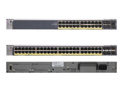 NETGEAR Stackable, PoE Managed Gigabit switch GSM7252PS allows the most flexible and easy-to-deploy Gigabit Power over Ethernet infrastructure. All the 48 ports of 10/100/1000 Mbps interfaces support 802.3af PoE standard with a comfortable 384 watts total budget. Two built-in 10 Gigabit Ethernet SFP+ interfaces on the front and two additional 10 Gigabit module bays on the rear, permitting both uplinks and local/distant stacking, provide versatile 10 Gigabit deployment possibilities.