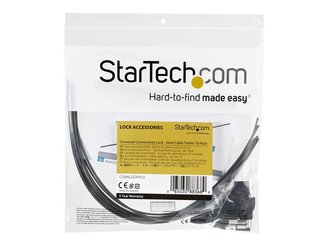 Säkrar kablar och adaptrar i styrelserum, arbetsstationer och i andra utrymmen för att förhindra kostsamma stölder eller oavsiktlig förlust. Säkerhetslåskablarna av stål erbjuder en fysisk säkerhet genom att dina kablar och adaptrar fästs till varandra. Skydda din investering Paketet med 10 säkerhetslåskablar ger dig ett enkelt och kostnadseffektivt sätt att minska behovet av att alltid behöva byta ut kablar i entrén, allmänna utrymmen, i arbets- eller mötesytrymmen. De säkrar dina kablar och adaptrar och håller dem organiserade och ser till att du alltid har rätt kabel på rätt ställe. Styrkan av stål Säkerhetslåskablarna är tillverkade av en hållbar vinylbelagd stålkabel som ger ett mycket effektivt stöldskydd. Snabb och enkel installation Den flexibla stålkabeln är enkel att vira runt dina kablar och adaptrar, och den säkras med ringformade metallbeslag med hjälp av ett vanligt krympverktyg (medföljer inte). För mångsidig användning klipper du av 300 mm långa bitar av stålkabeln med en avbitare (medföljer inte). Stålkabeln kan användas i olika längder beroende på utrymmesbehov eller användning av kablar och adapters. Tilltalande design Som ett alternativ kan du täcka de ringformade metallbeslagen med svart krympslang (valfritt). TAA-kompatibla CONNLOCKPK10 täcks av StarTech.coms 5-årsgaranti och gratis livstidsgaranti på teknisk support.